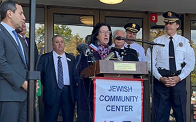Today, Jewish Federation in the Heart of NJ Executive Director, Susan Antman, joined and applauded Congressman Frank Pallone Jr. at a press conference at the JCC of Middlesex County — along with Mayor Jonathan M. Busch of Metcuhen, Mayor Sam Joshi of Edison, Assemblyman Sterley Stanley, Assemblyman Robert Karabinchak, Edison Township Police Department, and Edison YMCA — demanding social media platforms take action against violent content, antisemitism, and disinformation about Israel.