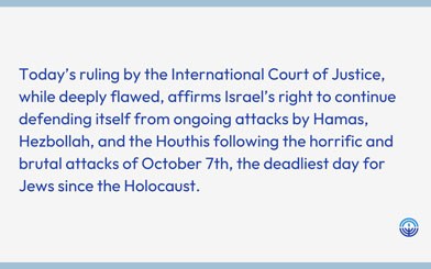 - Today’s ruling by the International Court of Justice, while deeply flawed, affirms Israel’s right to continue defending itself from ongoing attacks by Hamas, Hezbollah, and the Houthis following the horrific and brutal attacks of October 7th, the deadliest day for Jews since the Holocaust.