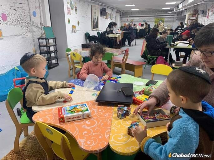 Pictured here: Children who have remained in Zhitomir at play in a reinforced bomb shelter at Chabad of Zhitomir's Ohr Avner Jewish Day School.