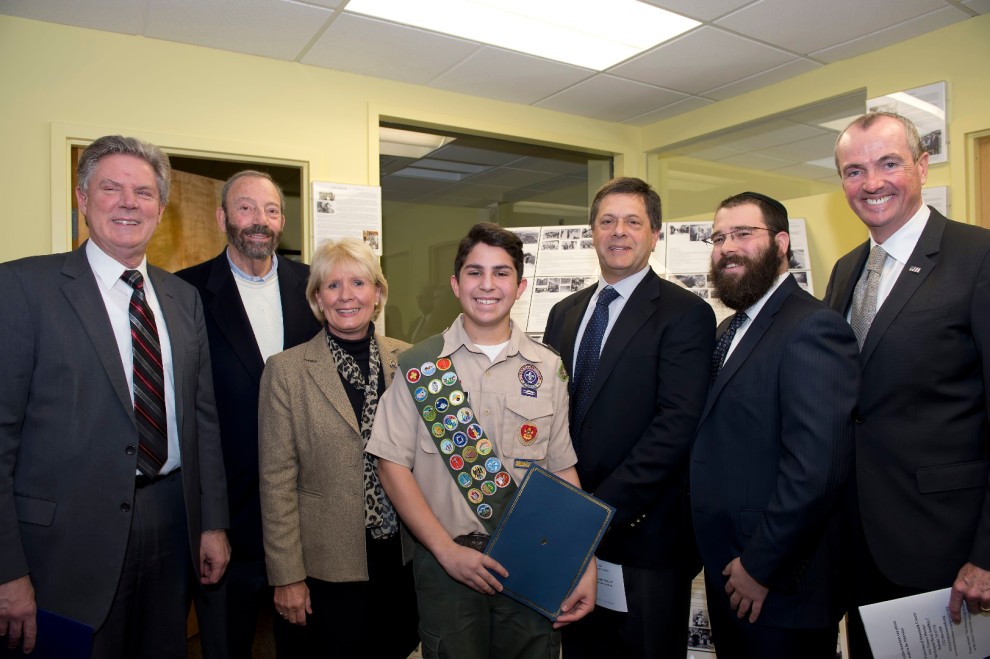 Taking part in the Feb. 1 dedication ceremony were: (Left to Right): Congressman Frank Pallone, Jr., Dr. Stu Abraham (Past President of the Jewish Federation in the Heart of New Jersey), Assemblywoman Mary Pat Angelini, (District 11), Alex Roberts, Mr. Joe Hollander (Past President of the Jewish Federation in the Heart of New Jersey ), Rabbi Laibel Schapiro (Chabad at the Shore), Philip D. Murphy (Former U.S. Ambassador to Germany)
