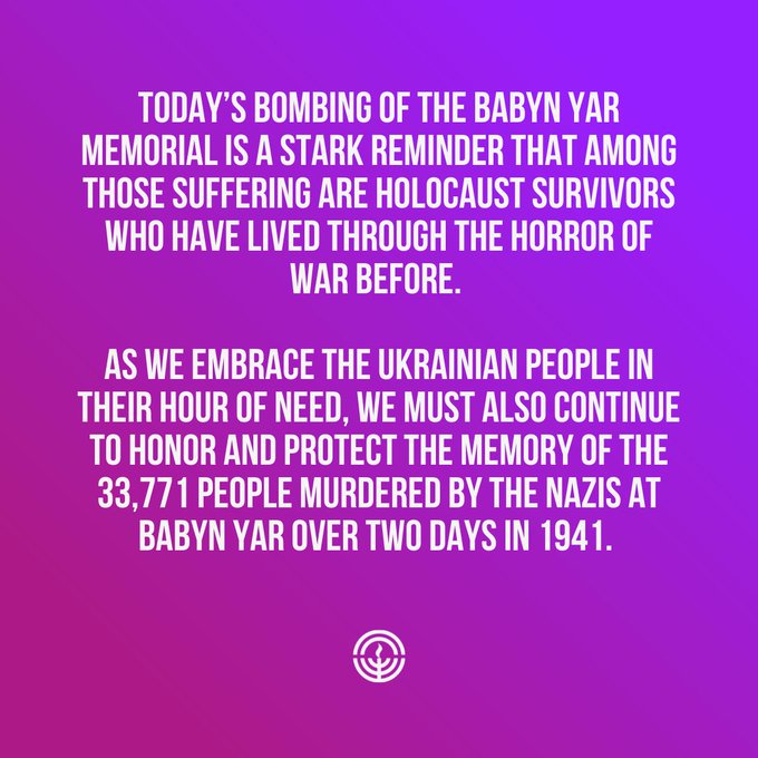 Today’s bombing of the Babyn Yar Memorial is a stark reminder that among those suffering are Holocaust survivors who have lived through the horror of war before. As we embrace the Ukrainian people in their hour of need, we must also continue to honor and protect the memory of the 33,771 people murdered by the Nazis at Babyn Yar over two days in 1941. We pray that all Jewish communities and other civilians in the region remain safe.