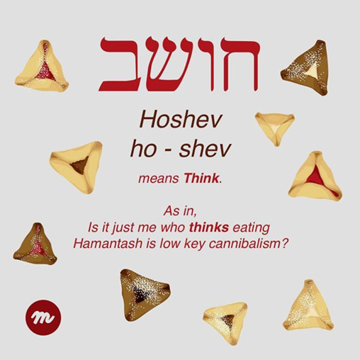 The Hebrew word of the week: Hoshev – think. We all think about Purim and in Israel, Purim is a very big holiday for everyone, especially for kids. Everyone dresses up in costumes and there is a big celebration!