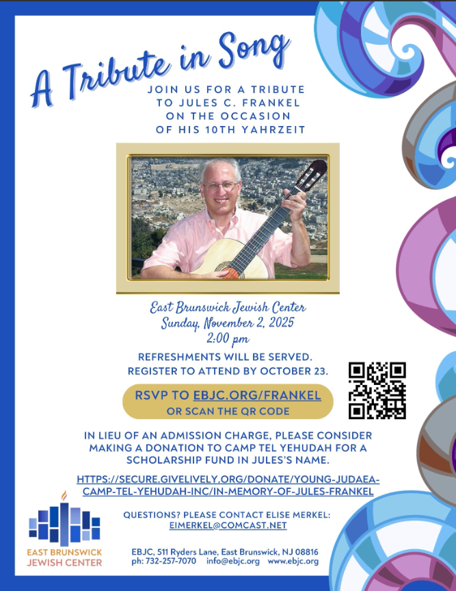 This program will start on Sunday, November 2, 2025 at 2 PM at the East Brunswick Jewish Center. This is a tribute to Jules C. Frankel, and an afternoon of song.